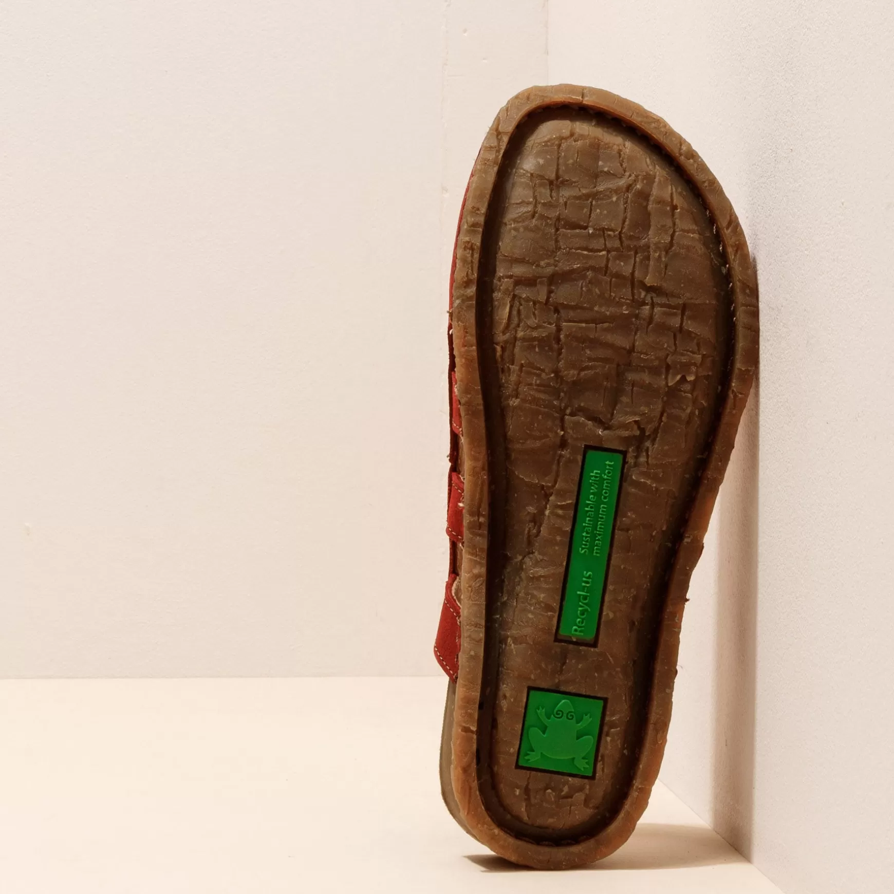 En Sandal, Der Kombinerer Ydersål Af Genbrugsgummi Og Indersål I Ét Stykke, Og Dermed Reducerer En Komponent Og Lette…
